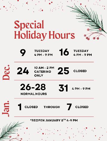 Regular Hours CLOSED Monday and Tuesday and Major Holidays OPEN Wednesday thru Saturday - 4:00pm until 9:00pm Sunday - 4:00 PM until 8:00pm